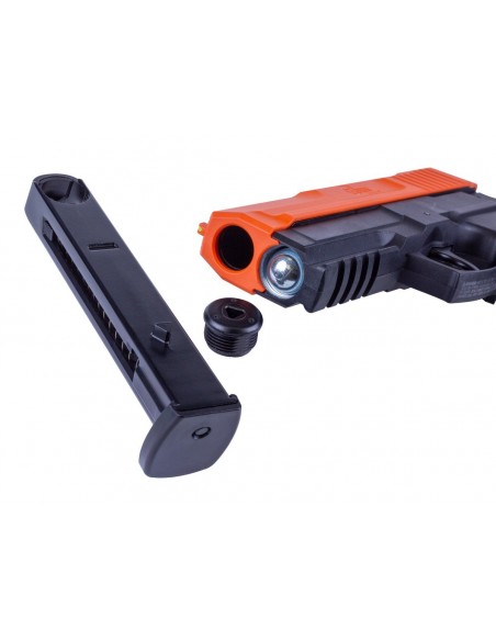El kit de la pistola incluye un estuche, tres tanques de CO2 de 12 gramos, seis municiones de goma, seis ,municiones de pimienta y seis municiones de pólvora inerte. Un cargador de seis tiros sin caída facilita la carga de munición y, al tener el tamaño de un arma real, se puede transportar con facilidad. Presenta una excelente ergonomía, un riel para accesorios y miras de fibra óptica para disparos precisos.
