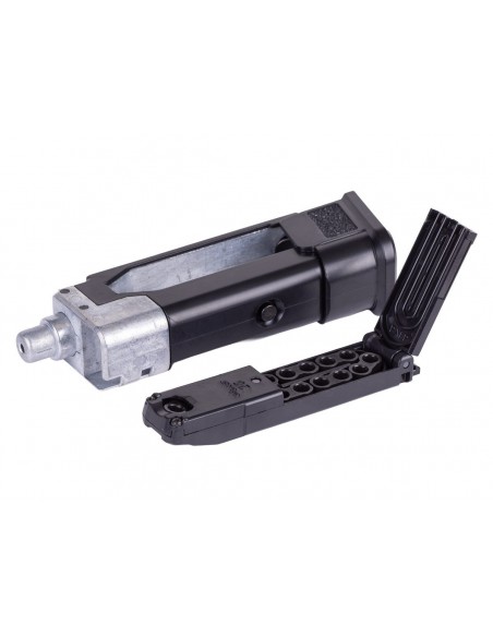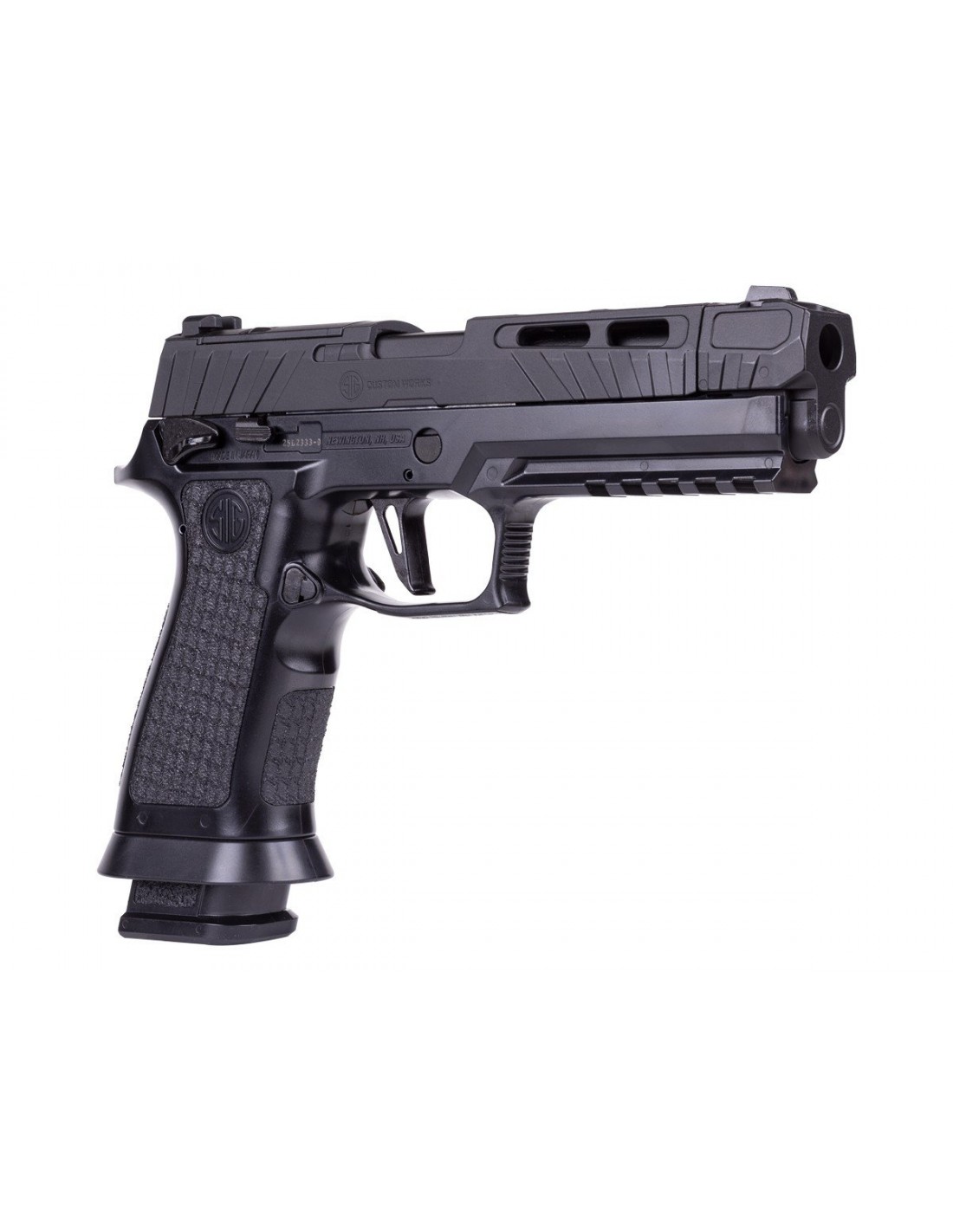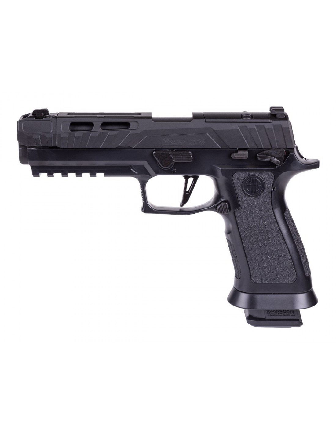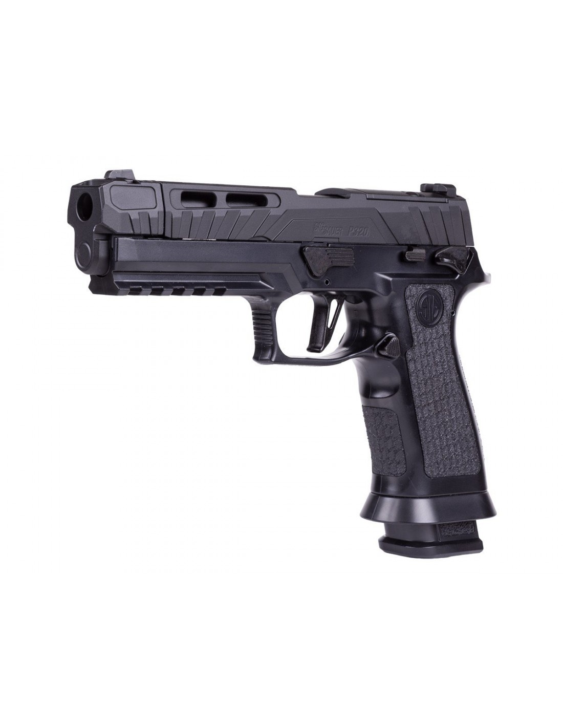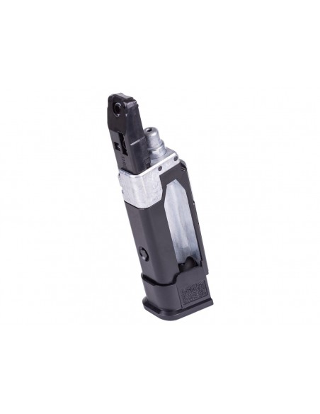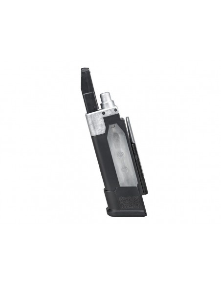 El módulo de empuñadura texturizada X-Series incorpora un brocal de cargador ampliado, facilitando recargas rápidas y eficientes. Además, el cambio del cartucho de CO₂ es práctico y seguro gracias al sistema patentado de carga con palanca tipo leva de SIG Sauer.